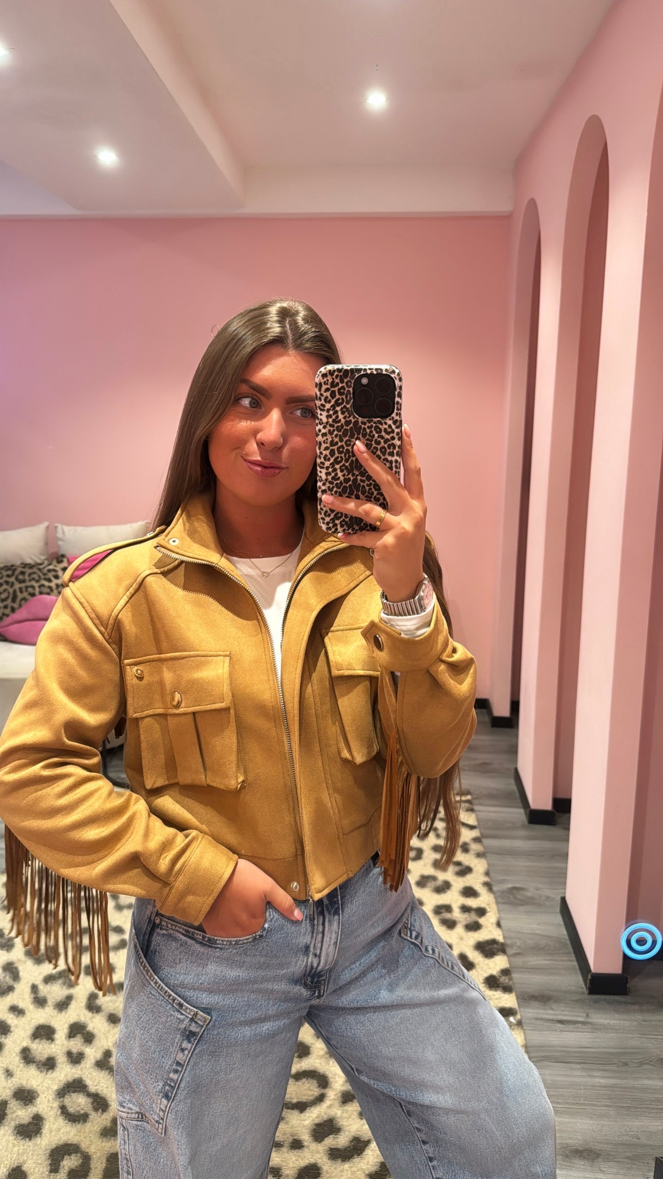 Het jasje heeft franjes op de armen, schouders en rug en heeft een suède look.