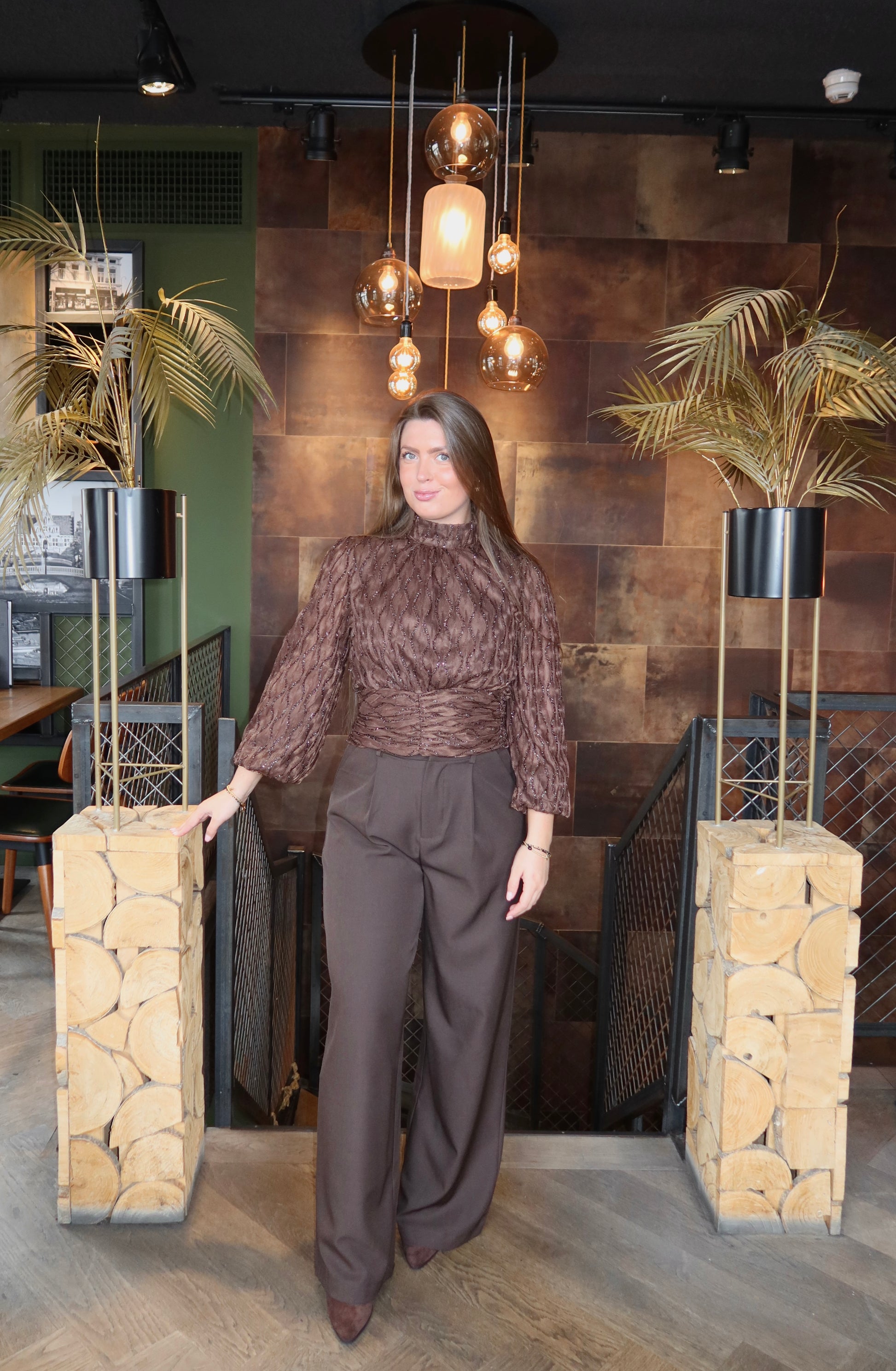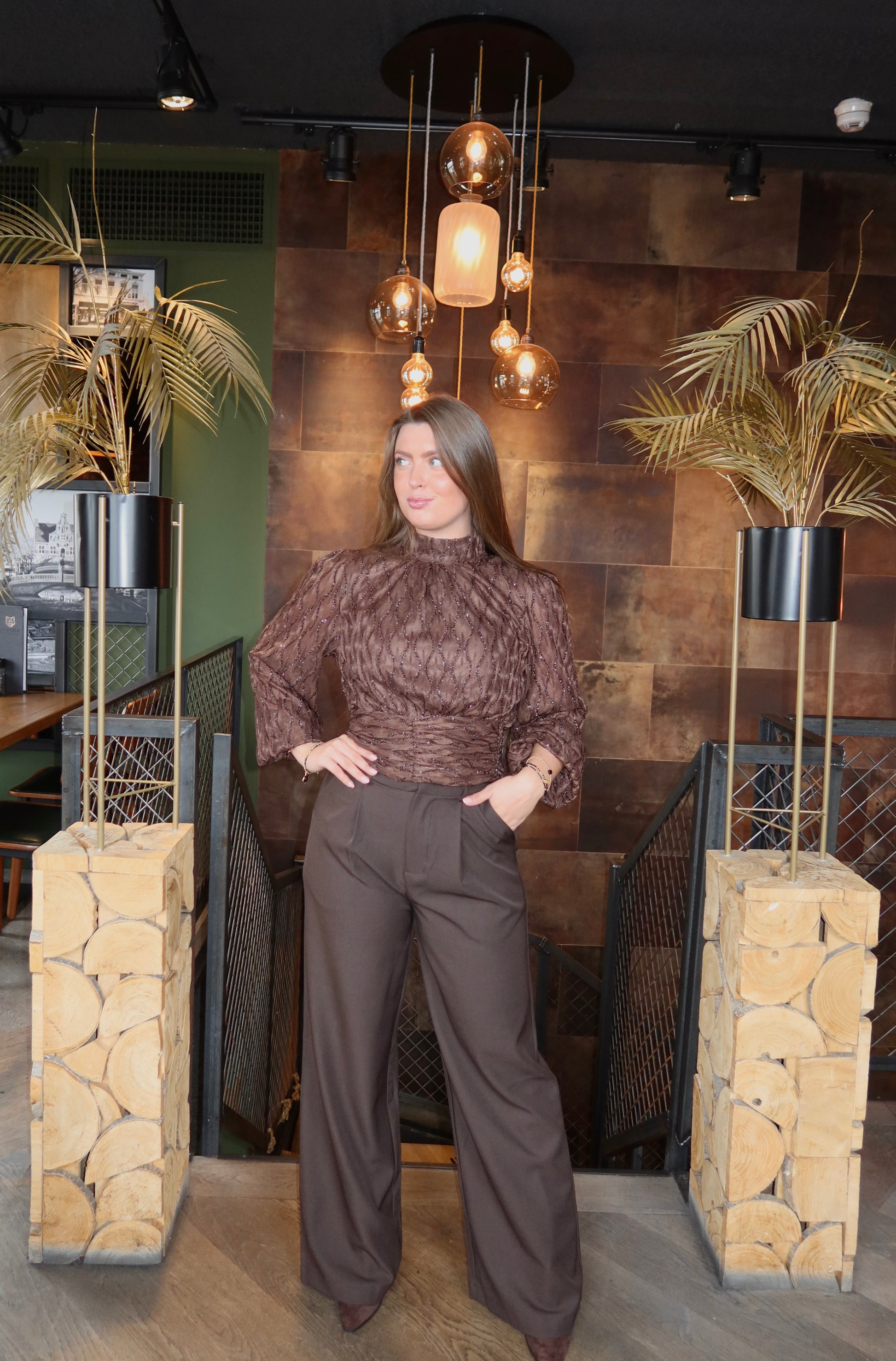 Heel mooie top met bruine lurex details. Imani draagt hiervan de maat S