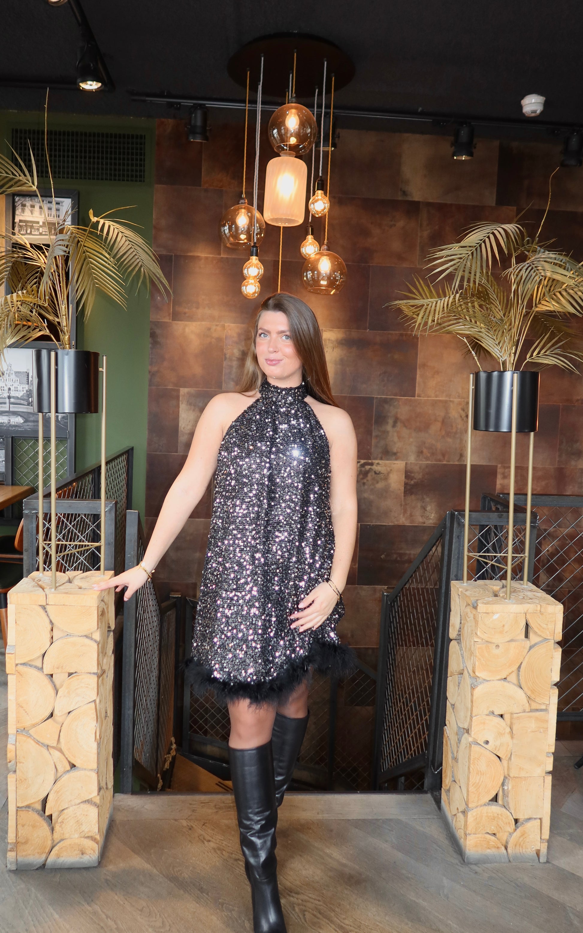Jurkje met pailleten in een A lijn model. Met leuke veren aan de onderkant. Jurkje valt ruim.
