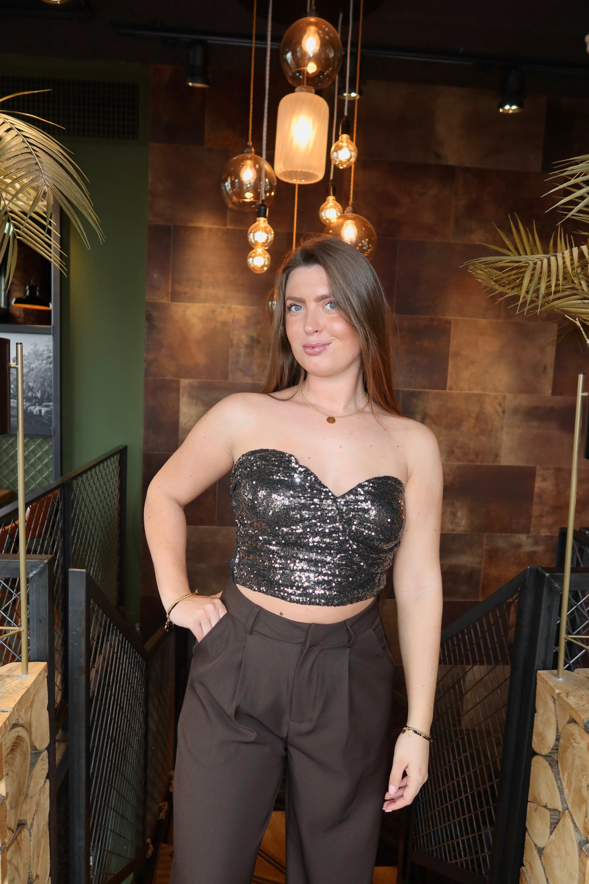Heel mooie top met bruine pailleten Imani draagt hiervan de maat S