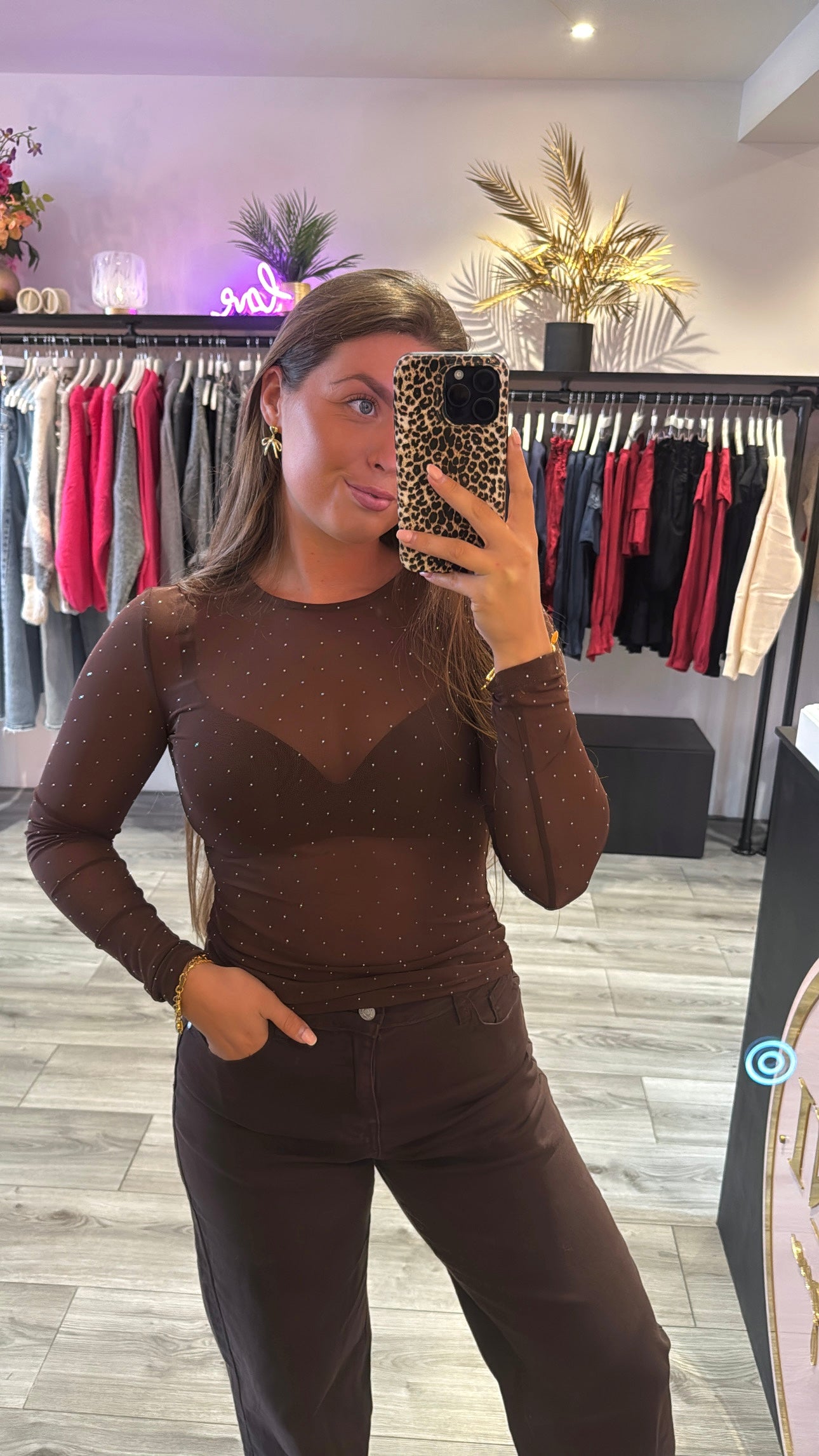 Mooie mesh top met strass steentjes op de voor en achterkant. Imani is 1.65 en draagt maat S van deze top.