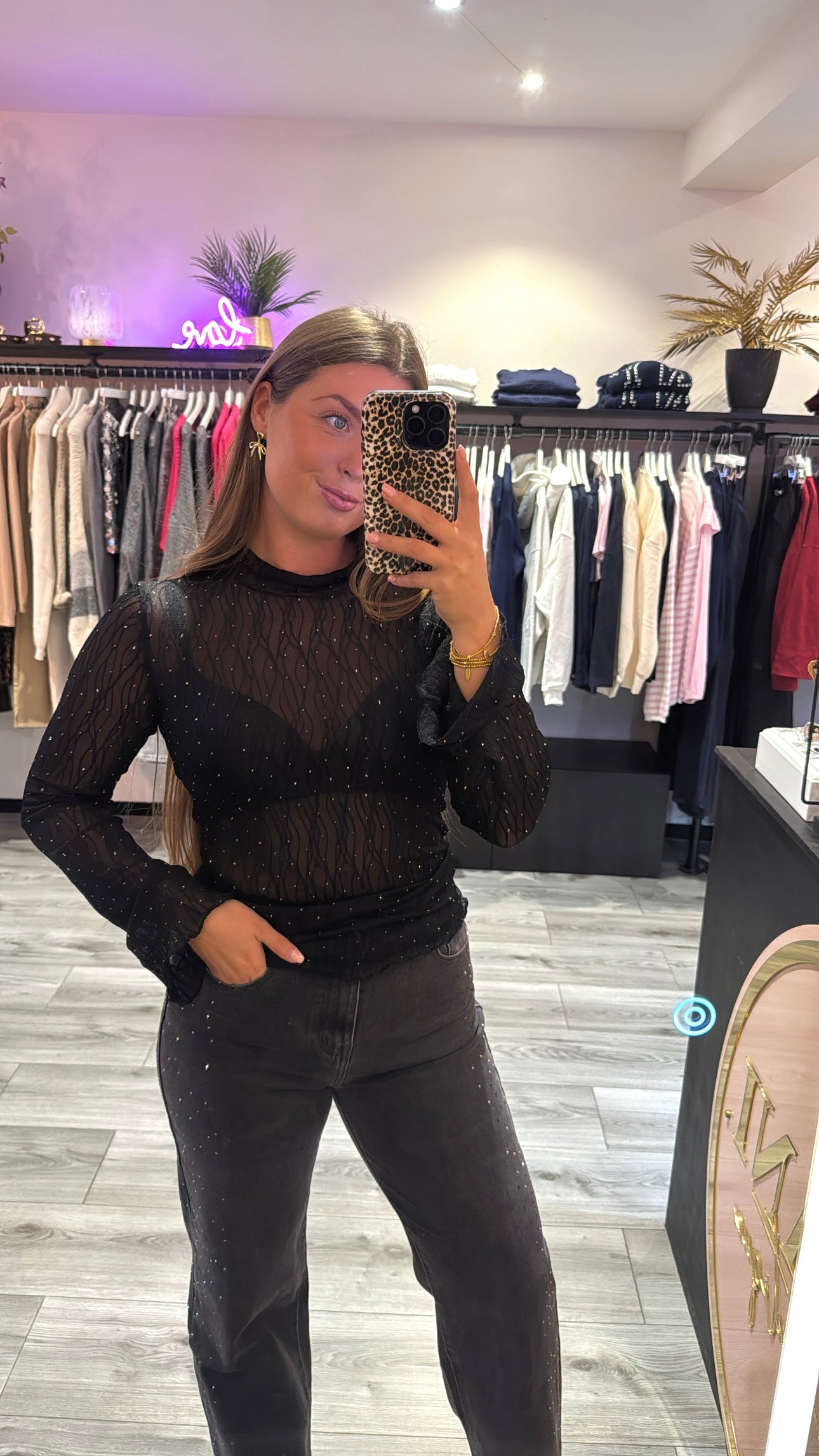 Mooie mesh top met strass steentjes op de voor en achterkant. met een leuke uitlopende mouw. Imani is 1.65 en draagt maat S van deze top.